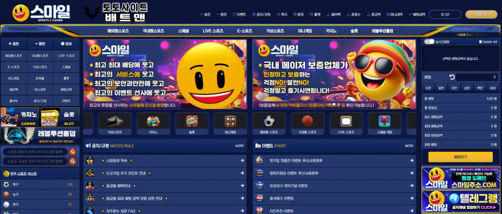 안전하고 신뢰할 수 있는 배팅 플랫폼을 찾고 있다면 스마일 토토 그 해답이 되어드립니다. 국내 1위 검증기관인 배트맨의 철저한 심사와 인증을 거친 스마일 토토는 투명하고 안정적인 시스템을 갖춘 프리미엄 배팅 사이트로, 수많은 이용자들에게 신뢰받는 서비스를 제공하고 있습니다.